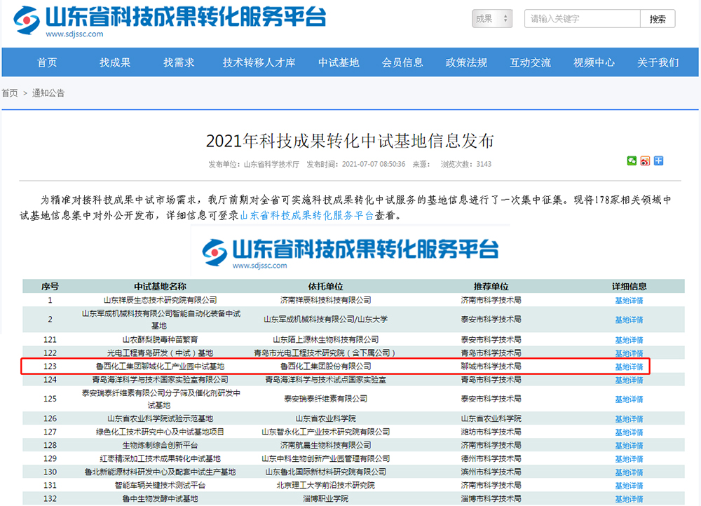 魯西化工集團聊城化工產業園中試基地進入山東省科技成果轉化服務平臺