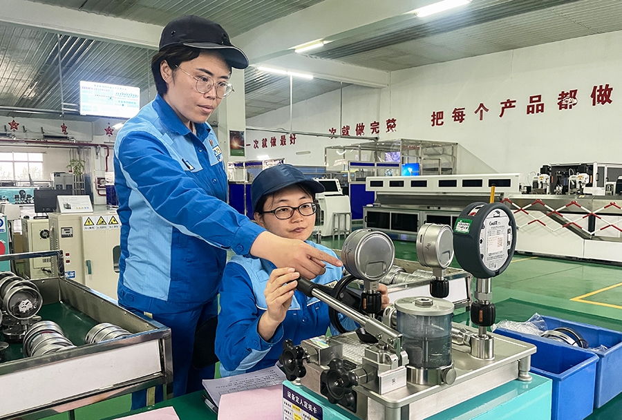 干一行、愛一行、專一行、精一行。從壓力表組裝、變送器校驗,到膜片焊接、法蘭變送器注油……她不但能夠熟練掌握每一道工序的操作,還善于發現和解決影響產品制作的各種生產瓶頸。壓力表、變送器的制作工序繁瑣復雜,工作流程稍微有停滯,就會影響整個工序的運行。隨著產品類型的增多,打壓工序原有的打壓工裝已不能完全滿足各種法蘭的打壓需求,尤其是特殊工藝要求的法蘭工裝。為解決這一難題,張鳳娟白天向機加工師傅學習取經,晚上自學CAD制圖,從一個簡單的法蘭孔畫起,直到一套完整的打壓工裝設計制作完成,在她不懈的努力下,打壓工作效率由每天10臺提高到30臺。