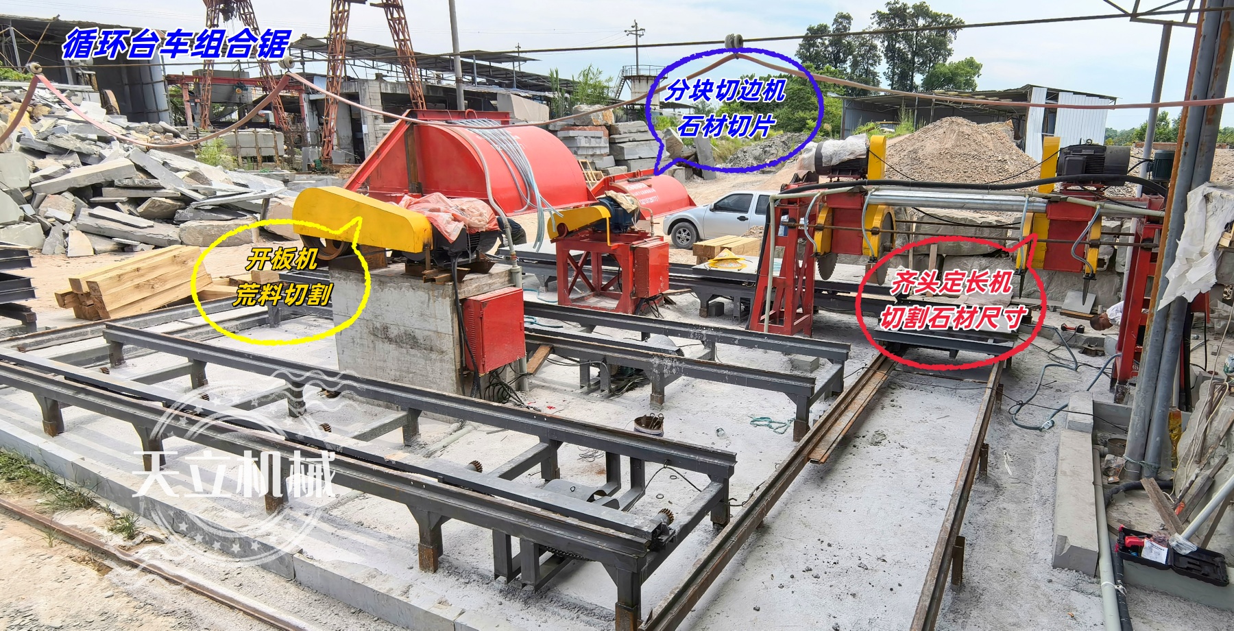 新循環(huán)臺(tái)車組合鋸由三臺(tái)設(shè)備組成(開板機(jī)、齊頭定長(zhǎng)機(jī)、分塊切邊機(jī)),協(xié)同完成荒料開板、定長(zhǎng)切割、分塊切邊全流程,構(gòu)建高效連貫的石材切割生產(chǎn)線。專為路沿石、條石、墓碑石等石材設(shè)計(jì),采用循環(huán)臺(tái)車與高強(qiáng)度鋸條技術(shù),實(shí)現(xiàn)連續(xù)精準(zhǔn)切割,提升生產(chǎn)效率30%以上。